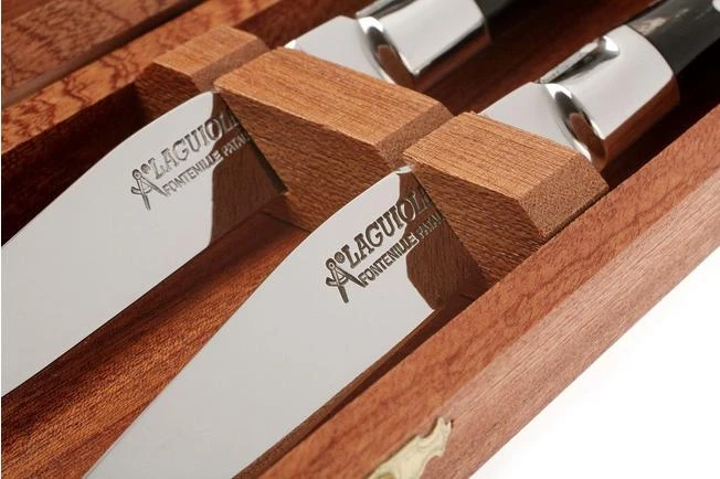 This Fontenille Pataud steak knife set is comprised of two Laguiole table knives with a handle made from buffalo horn. This material is rare and very valuable. In addition, Fontenille Pataud only uses the tips of the horns, as they are more ‘full’ and therefore more precious than the rest of the horn.