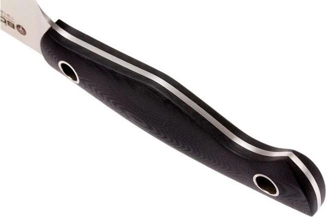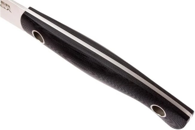 This Böker Saga utility knife is perfect when cutting small ingredients. Think of cutting slices of tomatoes and sausage or cutting an orange in half. Because of the two characteristic holes in the handle this utility knife is also a sight for sore eyes.