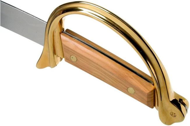 This Claude Dozorme champagne sabre is a sight for sore eyes. The gold looks amazing. The great thing about this sabre is that the blade merges with the handle. And you tell, literally this time. Not hidden in the handle, but visible up to the tip. Wow. The handle is made from one solid piece of olive wood. Solid and safely attached to the knife with rivets. It needs to be because this sabre is heavier than your average sabre. The handle is enhanced with a matching, yellow tassel. The blade is made from 50Cr15MoV-steel. Stainless, wear and tear resistant and definitely hard enough to sabre a bottle of champagne. The great thing about this champagne sabre is that it comes with a wooden display to make sure you can showcase it in your closet. But also on your table or on the wall this champagne sabre will be an eye catcher. Of course this Claude Dozorme champagne sabre comes with an certificate of authenticity.