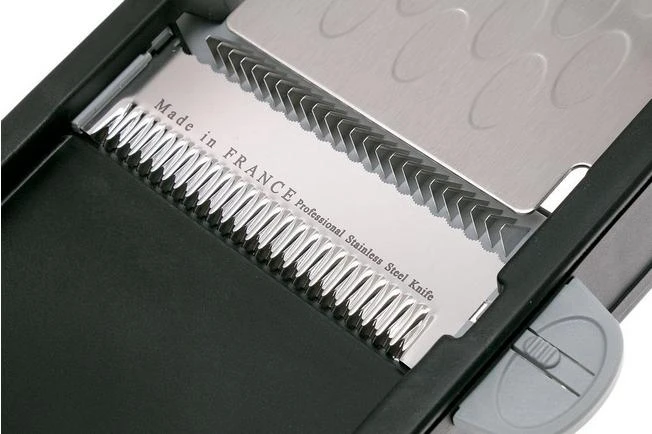 The DeBuyer Swing Plus is an excellent and well-thought-out mandolin. The mandolin comes with a double julienne knife and a double knife. Because of the stainless steel support plate with dimples, nothing will stick to the blade. With this Swing Plus, you can cut julienne strips, slices or serrated chips like a real chef: smooth, safe and professional!