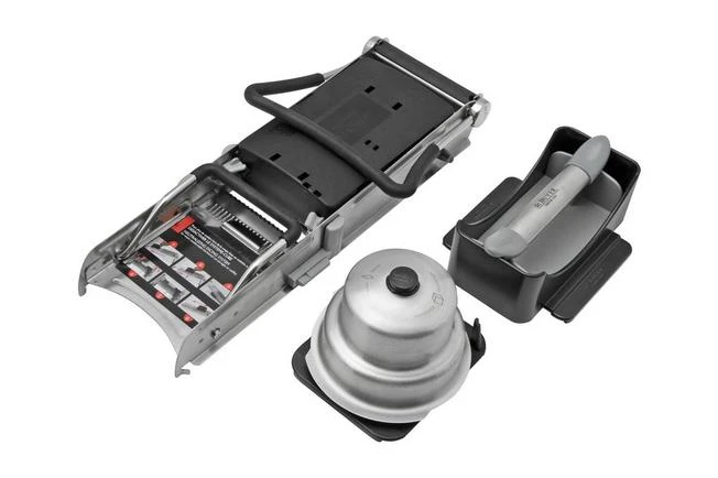 The de Buyer Ultra Revolution Mandolin is tough, sturdy and versatile. The stainless steel frame is solid as a rock and easy to clean. Slices, waffles, cubes, strips or diamond shapes: this mandolin can do it all. Of course you can easily adjust the cutting thickness from 0-10 mm. The only limitation lies in your imagination.