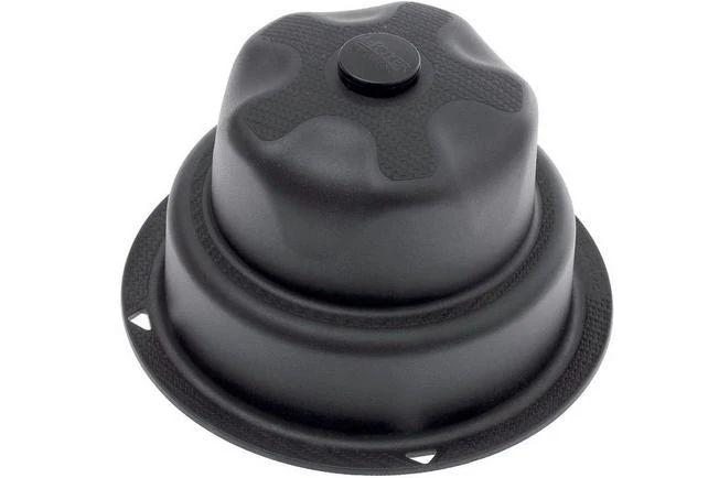 The de Buyer push button can be used for safely slicing fruits and vegetables on the Vantage mandolin. The push button consists of a plastic hat which has pins on the bottom the hold a product in place. There is a small spring behind the pins to keep a level pressure on the product and keep an identical result.