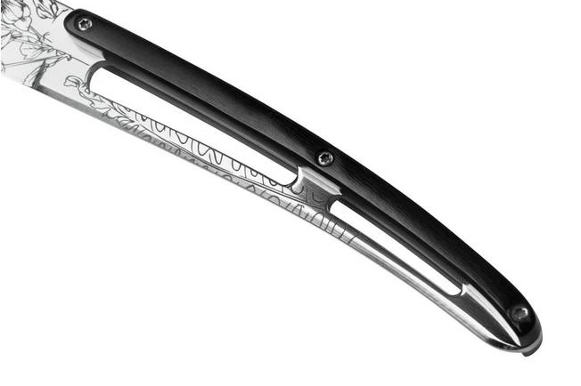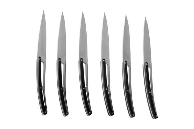 The Deejo steak knife set consists of six knives that have a unique design: the knives are ‘naked’, which means that the handle is only on the top side, and the bottom is part of the blade. The blades of the knives are each engraved with a unique flower pattern. This makes the knives a unique addition to your dining table.