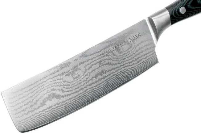 The Eden Classic Damast nakiri is a typical Japanese vegetable knife. The tip of the edge is slightly curved to make sure you can also cut perfect strips of vegetables from an angle. Although the shape might suggest it, we are not dealing with a cleaver. After all, the steel is a lot thinner which means that chopping could seriously damage the blade.