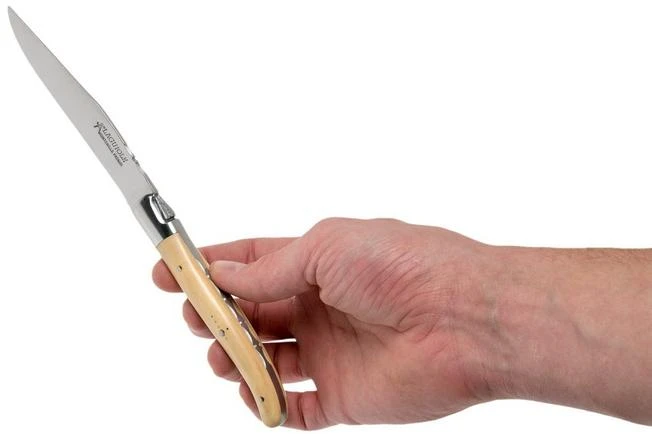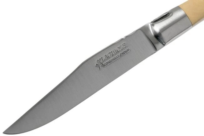 This Fontenille Pataud steak knife set is comprised of two Laguiole table knives with a handle made from French box wood. This is a light type of wood with a very fine structure. Box wood can only be purchased in small amounts and sizes which makes it a relatively expensive type of wood. The traditional ‘shepherd’s cross in the handle also looks amazing. The cross, comprised of rivets, refers to the legend of catholic shepherds who during their crusades to Spain, wanted to pray far away from a church or chapel. They put the knife, with the cross facing forwards, in the ground to say a prayer.