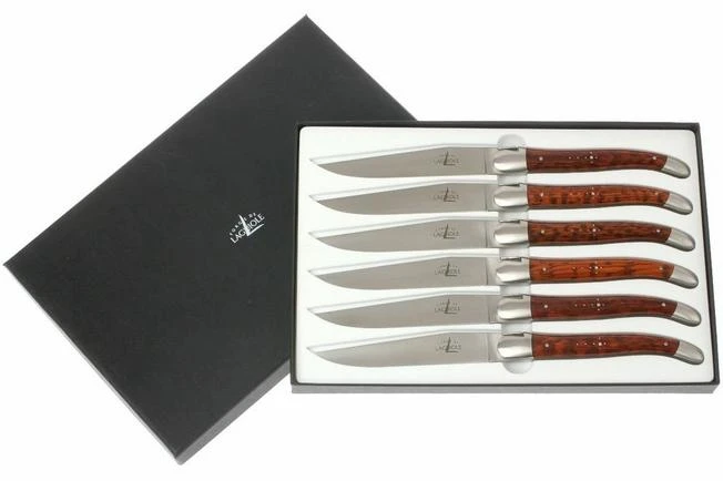 This Forge de Laguiole table knife set is comprised of six beautiful, handmade knives. The razor-sharp blade has a core made from French stainless steel, and retains its sharpness for a long time. The snake wood handles radiate luxury and are equipped with the characteristic shepherd’s cross in the shape of seven rivets. And, of course, the typical Laguiole bee can also be found on the spine of the blades.