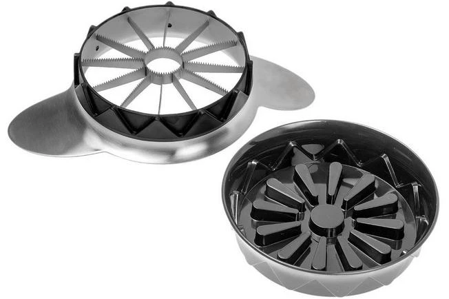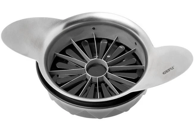 With the GEFU Pomo you can easily cut tomatoes or apples in twelve even chunks. The automatic cutting guide will help you get nice and even chunks. The blade is sharp, serrated and made from stainless steel. Place the cutter on the product and push the blades down using the handles. Without much effort you will cut through the product. The cutting surface is made from stainless steel. Sustainable and can be enjoyed for years, even after using it frequently. To prevent spilling the juice is caught in the cutting base. The base is made from plastic. However, both parts can simply be washed by hand or in the dishwasher. The GEFU Pomo is not only great for apples and tomatoes, but also for pears, pineapples- and other types of fruit. Ideal for making fruit salads or as a garnish on a cake.