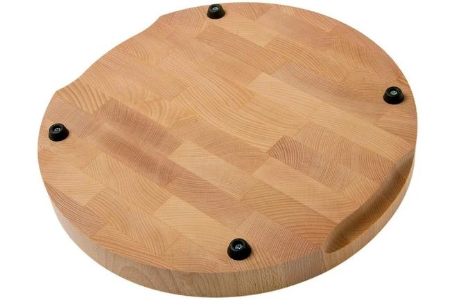 The Il Cucinino round cutting board end grain is a thick cutting board made from cubes of beech wood. As such you are left with a stunning and unique grain pattern. The cutting board is enhanced with four rubber feet to make sure it stays in place on your counter top and two handles in order to hold it. The cutting board has a diameter of 35 cm and is 4 cm high.