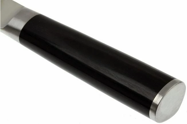 The kitchen knives of the Kai Shun Pro Sho-series have a blade made of VG10-steel which is hardened until an extremely high value of 61 HRC. Combined with the special way of sharpening in which one side is sharpened and the other side is made hollow, these knives are a pleasure to work with. They are truly razor sharp. Ergonomically speaking they have the well-known level of Kai Shun. The asymmetrical handles of laminated black pakka wood fit the hand perfectly.