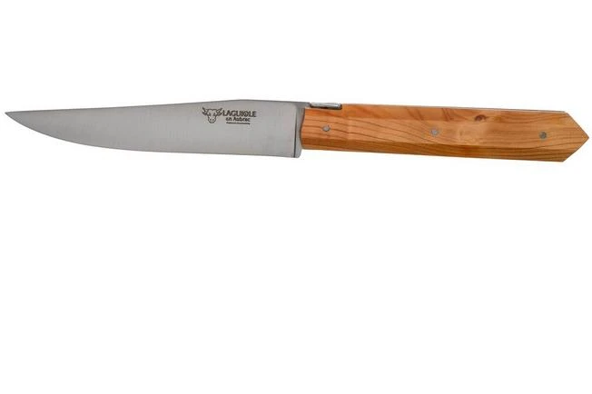 Remarkable about these Laguiole en Aubrac Re-move steak knives is that you can easily remove the handle from the blade. The main advantage is that you can clean the knives properly, but also that you can exchange the handle for one with a different type of wood. Whatever the material will suit your table best. These Laguiole knives are made to be used. The blade of these table knives is made from a stainless type of knife steel. It runs through to the juniper wood handle.