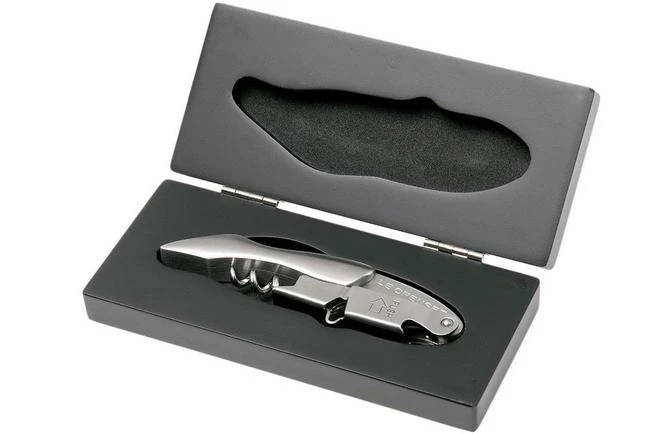 The Le Creuset WT-110 is a beautiful and complete waiter’s corkscrew enhanced with a double lever. This means that you remove the cork in two steps. Say goodbye to broken corks. A spring has been added to the lever to make sure it is very easy to use. On the back of the lever you will find a bottle opener for those rare individuals who prefer another type of drink. The steel handle has a sleek design and on the side you will find a foil cutter you can use to remove the foil that protects the cork when it is ageing in your cellar.