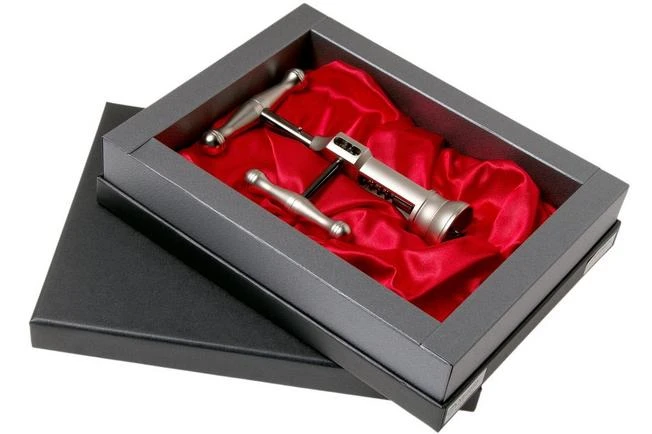 You immediately notice that the luxurious Masering King corkscrew is made from only top-quality materials. The all-metal corkscrew feels solid and heavy. In addition, the design looks stylish and the King corkscrew comes in a luxury gift box. The corkscrew is made by hand from brass and enhanced with a satin finish. The model is a replica of a 19th century London Rack corkscrew.