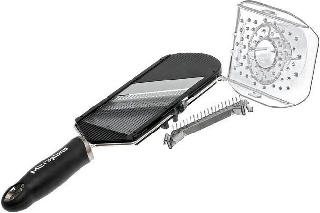 The Microplane Specialties Hand mandoline is a compact and affordable alternative for a large mandoline. Cutting slices with a thickness from 1 to 3 mm is child’s play with this mandoline. These thicknesses are easily adjusted with the slide on the edge of the blade. The julienne knife produces strips that are 3 mm wide. You set up the thickness of the strips with the same slide you use to set up the thickness of the slices.