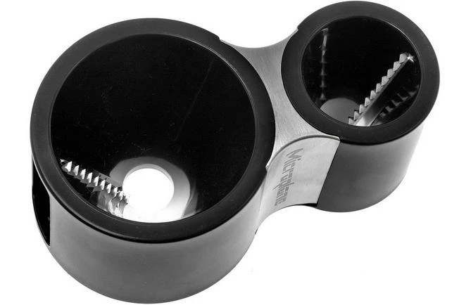 The Microplane Spiral Cutter is a practical kitchen tool that helps you transform different vegetables into decorative and tasty vegetable spaghetti. Because two halves of different diameters are a part of the Spiral Cutter you can easily cut different-sized vegetables. The strips this tool produces are approx. 5 mm thick.