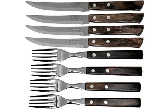 Tramontina Churrasco steak knives can tackle any type of barbecued meat. The blade is made from stainless steel and the handles are made from wood. Stainless steel rivets make sure the scales stay in place. The wood is modified and dishwasher proof according to the supplier. We do, however, not recommend putting these knives in your dishwasher.