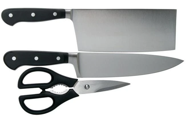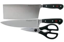 This Wüsthof Classic-3-piece knife set is comprised of two knives from the Classic collection and one pair of kitchen scissors. This Wüsthof knife set contains two chef’s knives to make sure you can always choose your favourite one. Whether you wish to cut meat, finely cut vegetables or crush garlic: the chef’s knife is incredibly functional. The Chinese chef’s knife is shaped like a cleaver but is meant to cut and chop herbs and vegetables. The scissors are nice and sharp and enhanced with serrations just along the edge, to make sure the material does not slip. Cleaning has never been so simple: just take the two pieces apart.