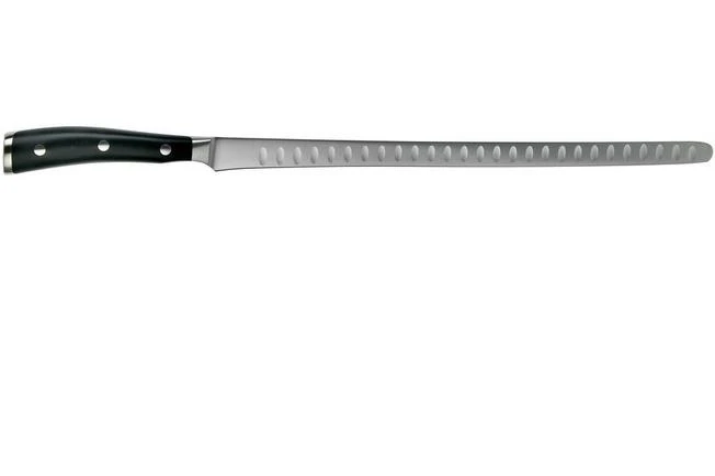 The Wüsthof Classic Ikon salmon knife 32 cm is truly the cream of the crop when it comes to top-quality salmon knives. The long blade ensures that you can cut thin slices of fish in one single movement. The low blade and the dimples ensure that the thin slices of salmon don’t tear because they stick to the blade.