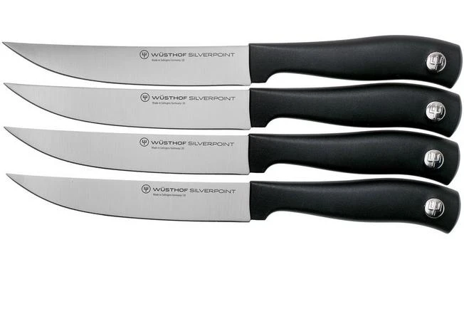 The Wüsthof Silverpoint 4-piece steak knife set contains four stunning Wüsthof Silverpoint steak knives. The steak knives are partially serrated. As such you can easily cut through large pieces of meat and the knife is less likely to become blunt!