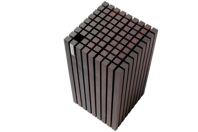 This stunning wooden knife block is enhanced with a unique design. It consists of several bars of wood between which you can place the knives. Due to the design of the block, there are no fixed sizes that a knife must have to fit into one of the openings. As such the block is very flexible in use. As long as the blade is not higher than 15 cm, and not longer than 20 cm, it will fit inside.