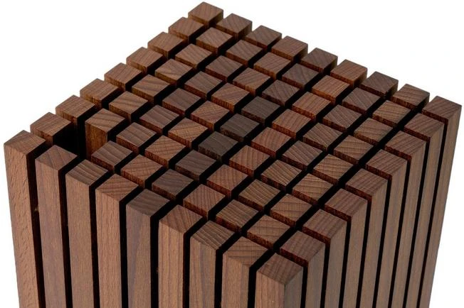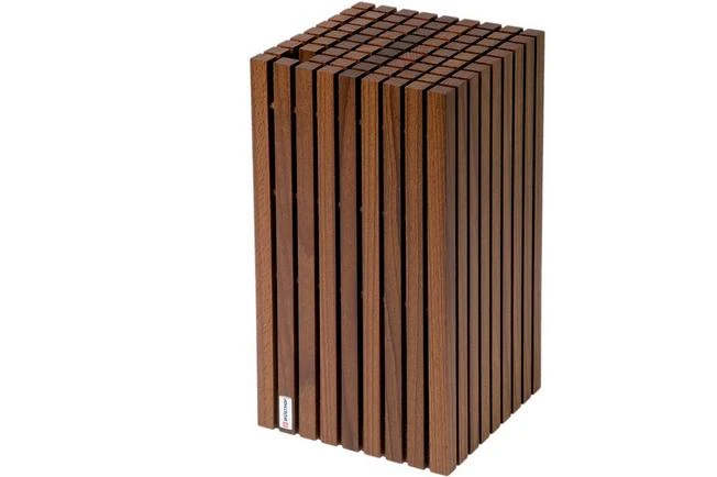 Designer knife block holds up to 12 knives of various sizes plus a honing steel. Thanks to the slots, this knife block is really versatile.