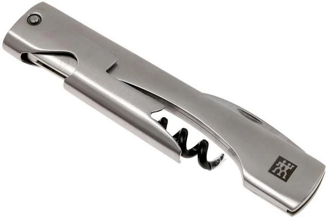 The easy to fold Zwilling Sommelier waiter’s corkscrew is a pro amongst the bottle openers. It combines three functions: foil cutters, corkscrew and bottle opener.